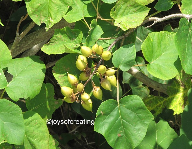 I looked up red bud seed pods and a photo of the rounder pods popped up. I followed it to a page that tells all about the “Paulownia tomentosa (common names empress tree, princess tree or foxglove tree) ”