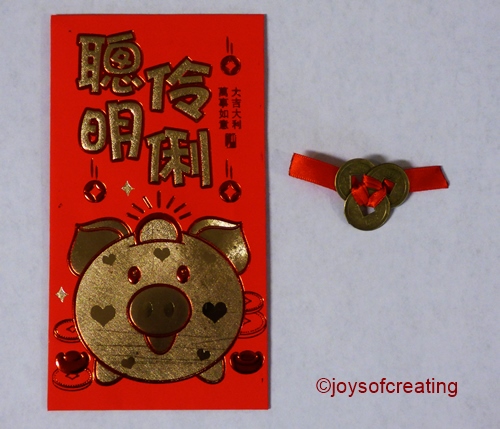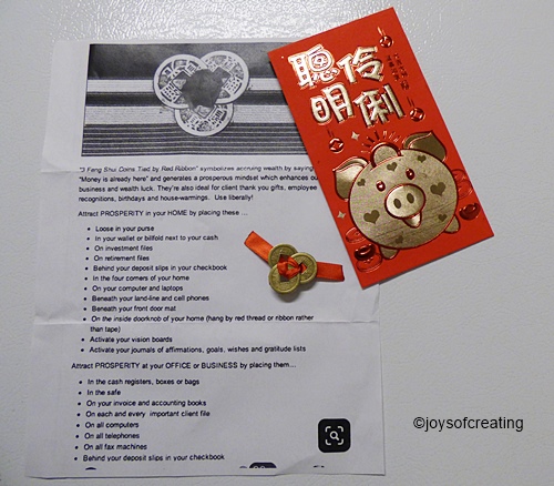 The gift is a bright red envelope with gold writing and a cute pig on it and inside is 3 Feng Shui Coins tied by a Red Ribbon. (I apologize for the photos of this special gift, I couldn’t get any of my cameras to show the actual shade of the pretty red color.)