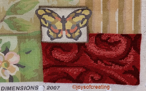 I’ve got only the lower right hand corner block done. I think it looks good. In real life this needlepoint’s colors are very pretty. I’m happy that I’m finally making this kit after all these years.