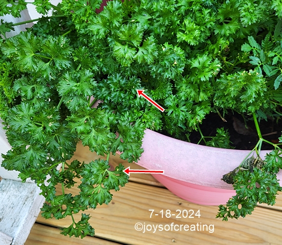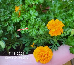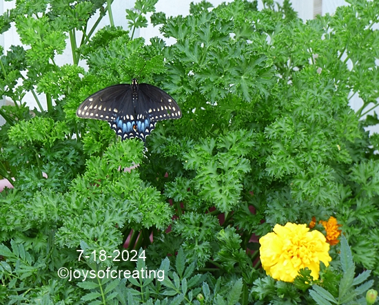7-18-2024 My curly parsley and marigold pot was visited by a female black swallowtail butterfly.