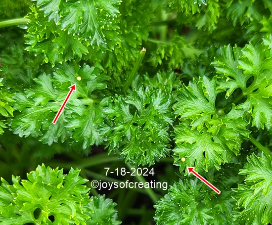 She laid over a half dozen eggs over the plant. I took a few photos of some of the eggs. So, pretty soon, there might be some baby caterpillars feeding and growing in the curly leaves.