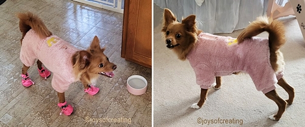 I bought Lucy a pink fuzzy warm suit and some pink snow-booties, in case the forecasted snowstorm comes and she wants to go outside to play. Unfortunately, she runs too fast to keep her booties on and slings them off. You can tell from the photo that her pink suit in a bit short for her long legs, but it will do, I think.