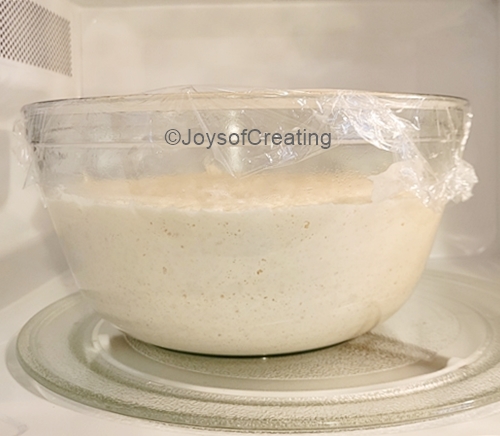I followed the directions, except for the amount of liquid. I left out 1/2 cup because when I added it to my flour mix, the mix started to become too soupy. I covered the bowl with plastic wrap and put it in a pre-heated microwave and left it to rise.