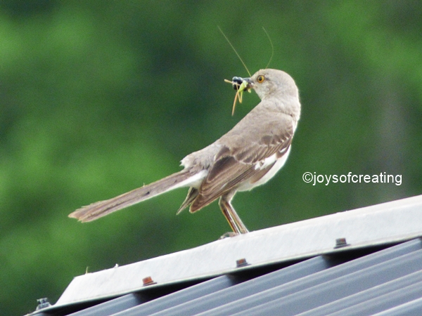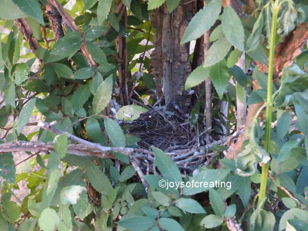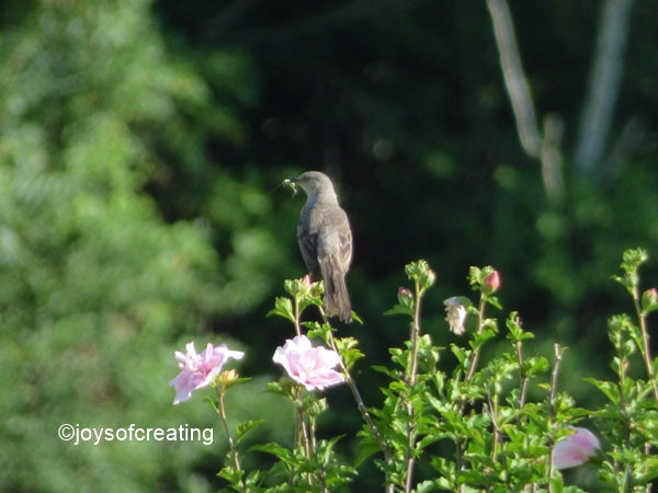 While trimming one of our snowball bushes, my husband found a nest of wee mockingbirdies. They were so cute.