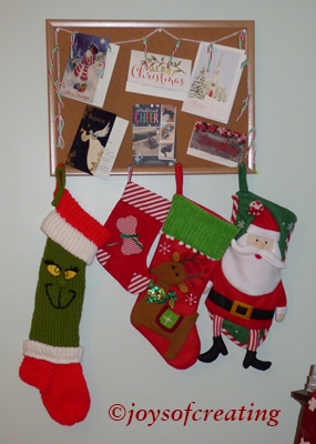 People don’t send out Christmas cards much anymore. We send out only about a half dozen. How to display the cards folks give us has always been an issue. This year, I had a brain storm and decided to hang a small cork board up to hang the cards on. I didn’t decorate the cork board much, but I’m happy with it. I plan to make this method of card display a part of our Christmas decor from now on.