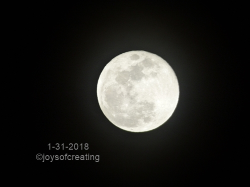 I focused in on the moon about half-full zoom, when I clicked the photo, the blue skies disappeared and and the moon glowed against the black of space. I don’t understand why? Nor do I understand why in the dimness of nightfall, on full-zoom, my camera picked up the terrain of the moon as well as it did. I thought sure it would be a blurry mess. My camera is a Canon SX500 IS and My photos aren’t NASA quality, but I’m happy with them.