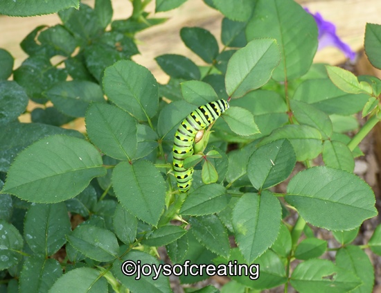 Yesterday evening I was de-beetling my roses when I found a swallowtail butterfly caterpillar on my yellow hybrid tea rose.