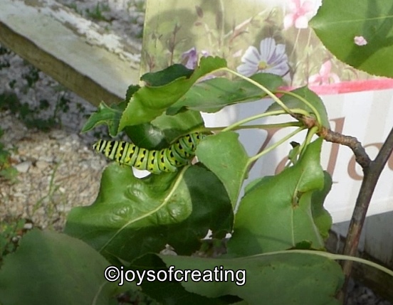 I had read that at a certain age these species of caterpillars roamed around before they go to the chrysalis stage. I thought this caterpillar was one step away from spinning silk, so my husband got a pear tree branch for it to climb on. I carefully picked up the caterpillar and put it on the limb. We hoped that it we would get to watch it spin silk and make it’s chrysalis. But it kept climbing out onto to the leaves for a long while and then it fell off onto the ground.