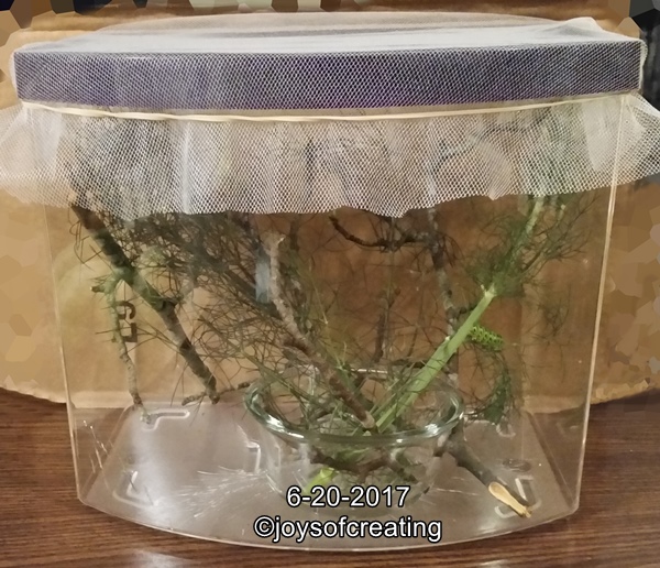 My husband liked the idea. He got a fresh small limb and trimmed the leaves off. He put it in the aquarium. I put a glass ramekin with a bit of water so the fennel won’t die too quickly. We added the caterpillar and some fennel.