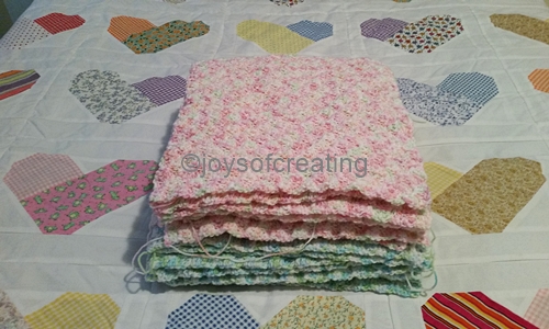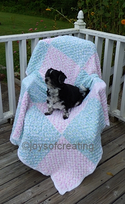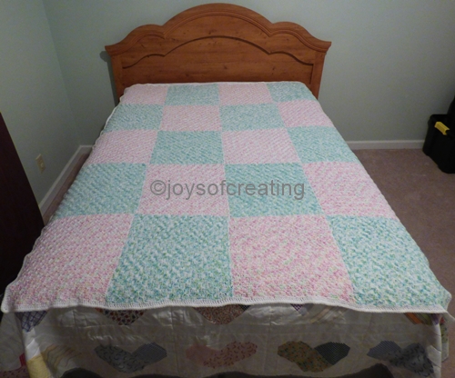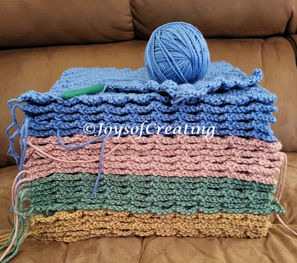 I used Rosy Cheeks ‘I Love This Yarn’ (Hobby Lobby) because I’ve had several skeins that I bought about 8 years ago. This blanket was a good opportunity to clear most of it out of my yarn stash.