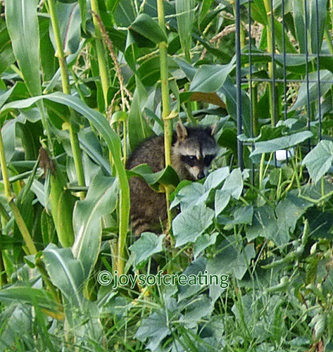 Every year we see signs of raccoons in our corn, but this cutie critter is the first time we actually seen a one in our corn. We got a good chuckle at seeing it. I’m glad I got a few photos of it too. It’s my first raccoon photos ever.