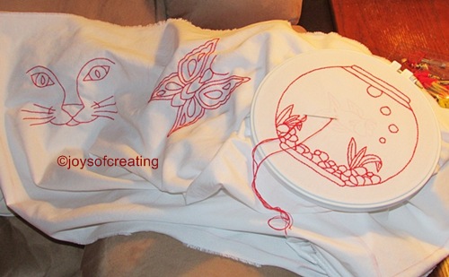 One of the reasons I’m opening a new blog is to keep up with my crafts again. At the moment, I’m going to post my progress on my redwork embroidery throw. I plan to start tomorrow and post a photo of a block each day. I’m hoping to have the throw finished by Christmas. I was inspired to make this throw when I was visiting my blogging buddy’s blog ‘EMZ-Piney Post‘ Charlotte’s very talented in quilting, embroidery, sewing, farming and many other wonderful things. I had never heard of Redwork until I saw it on her blog. I love the idea of only using one color. It’s quite enjoyable. I send big thanks out to Charlotte. 🙂