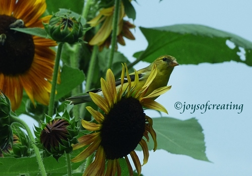 Another reason I love zinnias is they attract Yellow Goldfinches or as we like to call them, Canary birds.