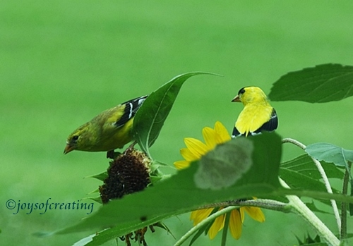 Now that some of the sunflower seeds are maturing, Mr & Mrs Goldfinch visits to enjoy a feast of them. I never tire of watching this beautiful and fun couple.