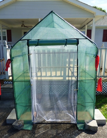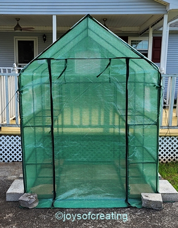 The new greenhouse has anchors on each outer corner to tie it down. We’re using concrete blocks on the lowest shelves and around the bottom edge of the cover as extra anchor weight.