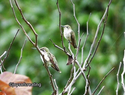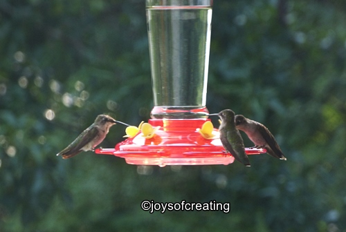 In the following days, there were more hummers visiting the feeders. They buzz and chitter and tease each other. They’re such fun to watch. It’s also fun to see how the feeder looks at different angles; the first photo is my view sitting on the porch looking up at the sky, this second feeder photo is my view of the same feeder from my kitchen window.
