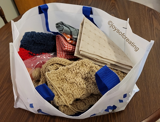 I have several sewing projects that needs to be done… maybe not needs too, but I really should make/finish them. I’ve few tote bags I crocheted and loomed that need linings and other sewing too. I enjoy designing and sewing. I don’t know why I procrastinate about it so much. I put my projects in a large tote bag along with the notions needed to complete them.