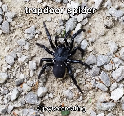 He called out for me to come and see the spider that had fell out of the hood. I hurried over and was surprised to see one of the biggest trapdoor spiders that I’ve ever seen. Its body was at least 3 cm long (a bit over an inch). With its legs it was even bigger and scarier.