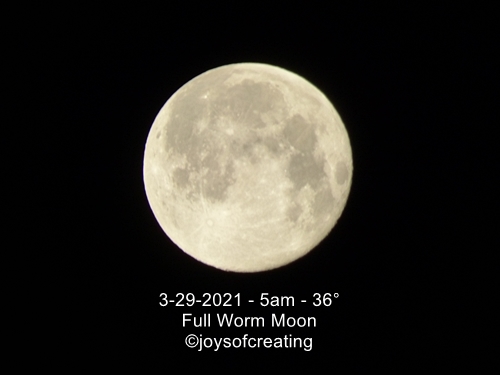 3-29-2021: I stepped outside this morning and took a photo of the full moon. Yes, I know I should have taken it last night, but I forgot.