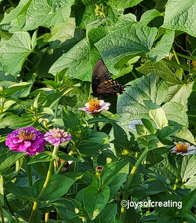 The other day, I was taking pictures, with my phone, of a lovely patch of zinnias growing in our carrots and cucumbers. A beautiful female Black Swallowtail Butterfly was feeding on the blooms. I managed a few photos, hoping one of them would be fine. I wasn’t sure about the zoom feature, but it turned out okay.