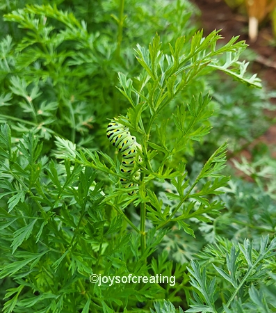 Yesterday, as I was looking to see if the carrot tops had actual carrots making under any of them. I was surprised to see an adorable black swallowtail caterpillar feeding quietly on a carrot top. I was so excited.